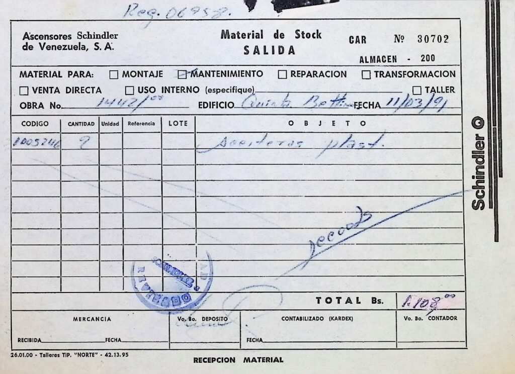 Recibo de Ascensores Schindler de Venezuela, S.A. por servicios prestados en la residencia familiar «Quinta Bettina».