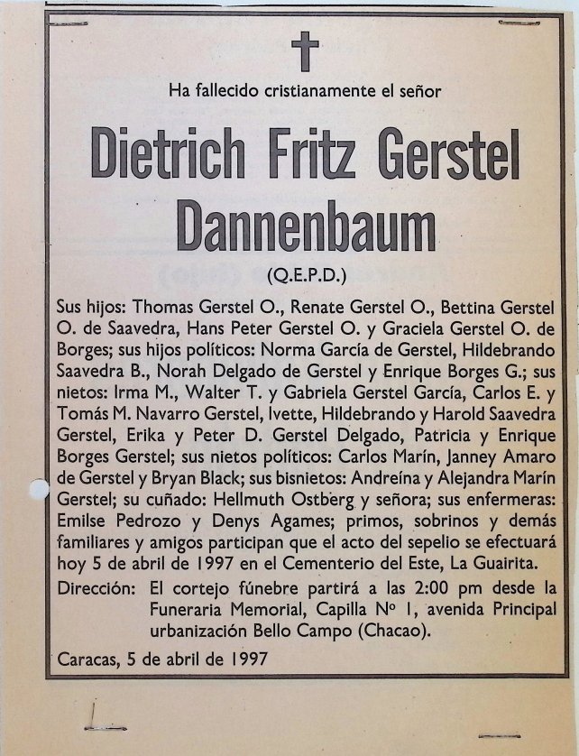 Participación pública que marca el cierre definitivo de la biografía de Dietrich Fritz Gerstel. El documento despliega la extensa red familiar que logró construir en Venezuela —hijos, nietos y bisnietos—, contrastando su partida multitudinaria con la soledad de su exilio inicial. Notablemente, incluye una mención a sus enfermeras (Emilse Pedrozo y Denys Agames), testimonio del cuidado constante y dedicado que recibió en la Quinta Bettina durante sus últimos años de postración.
